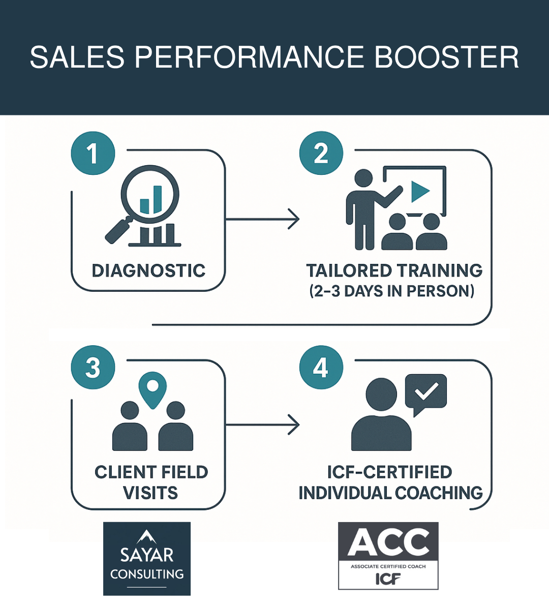 Nous intervenons auprès des équipes commerciales B2B pour améliorer leurs résultats grâce à une approche unique en 4 étapes :
