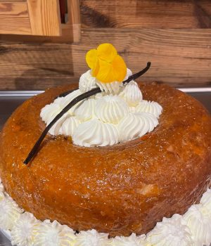 Moelleux à l’orange poêlé au beurre salé, sauce caramel et boule de glace pistache